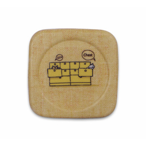 角丸型でカップをのせる部分は丸くくぼんでいます。厚みは9mmぐらいでコースターとしては厚みのあるタイプ。私たちはざぶとん型コースターの愛称で呼んでます。